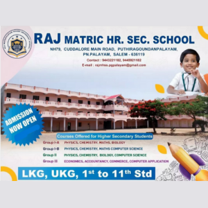 Raj Matriculation higher school was established in 1997 by Lion K.RAJU M.Sc.,B.Ed., at Yethapur, NH 79, Cuddalore Main road, Puthiragoundanpalayam. This school aims at departing best knowledge ans wisdom among children. It makes children to learn discipline and bestows attention for punctuality, regularity and Sincerity. Our institution is backed up with of well qualified and dedicated staff members to do their at most service to your children.